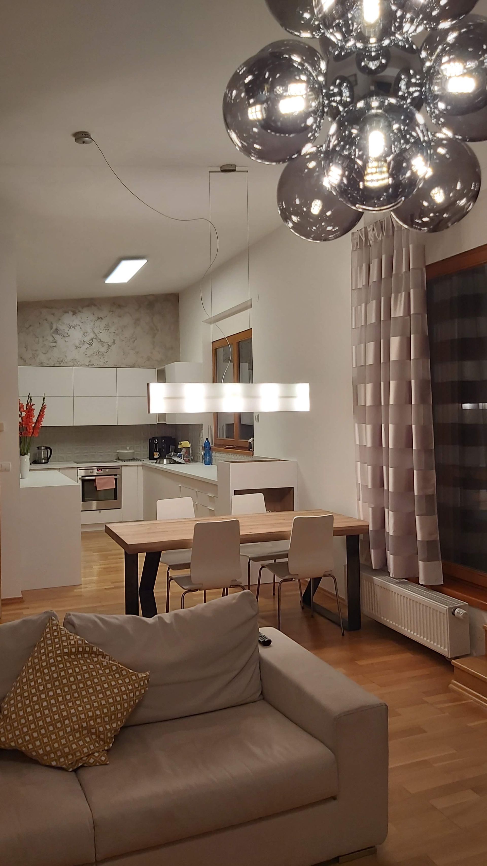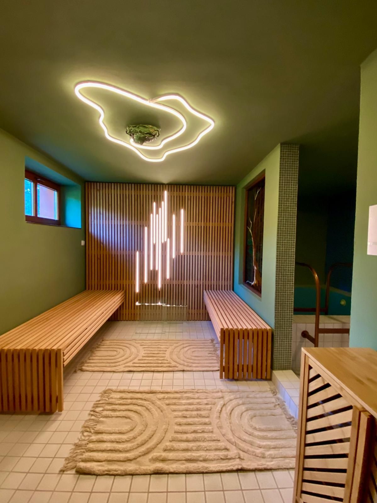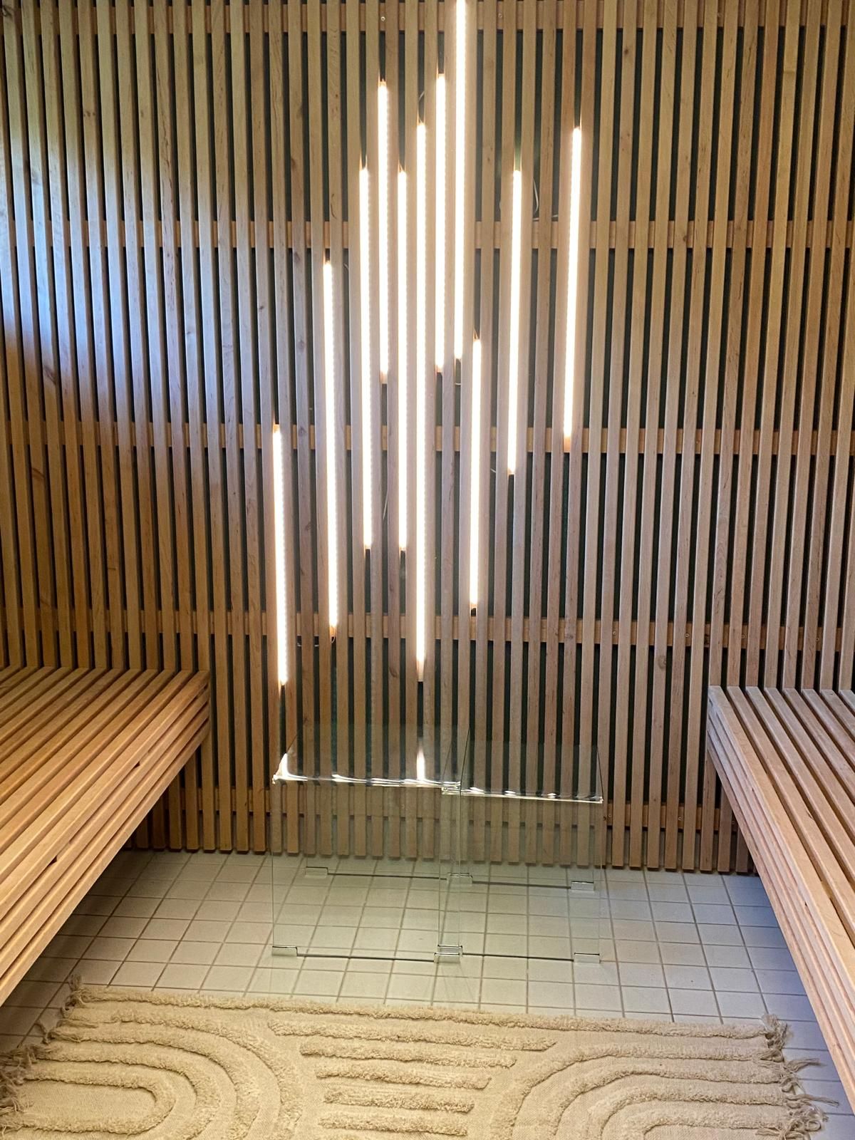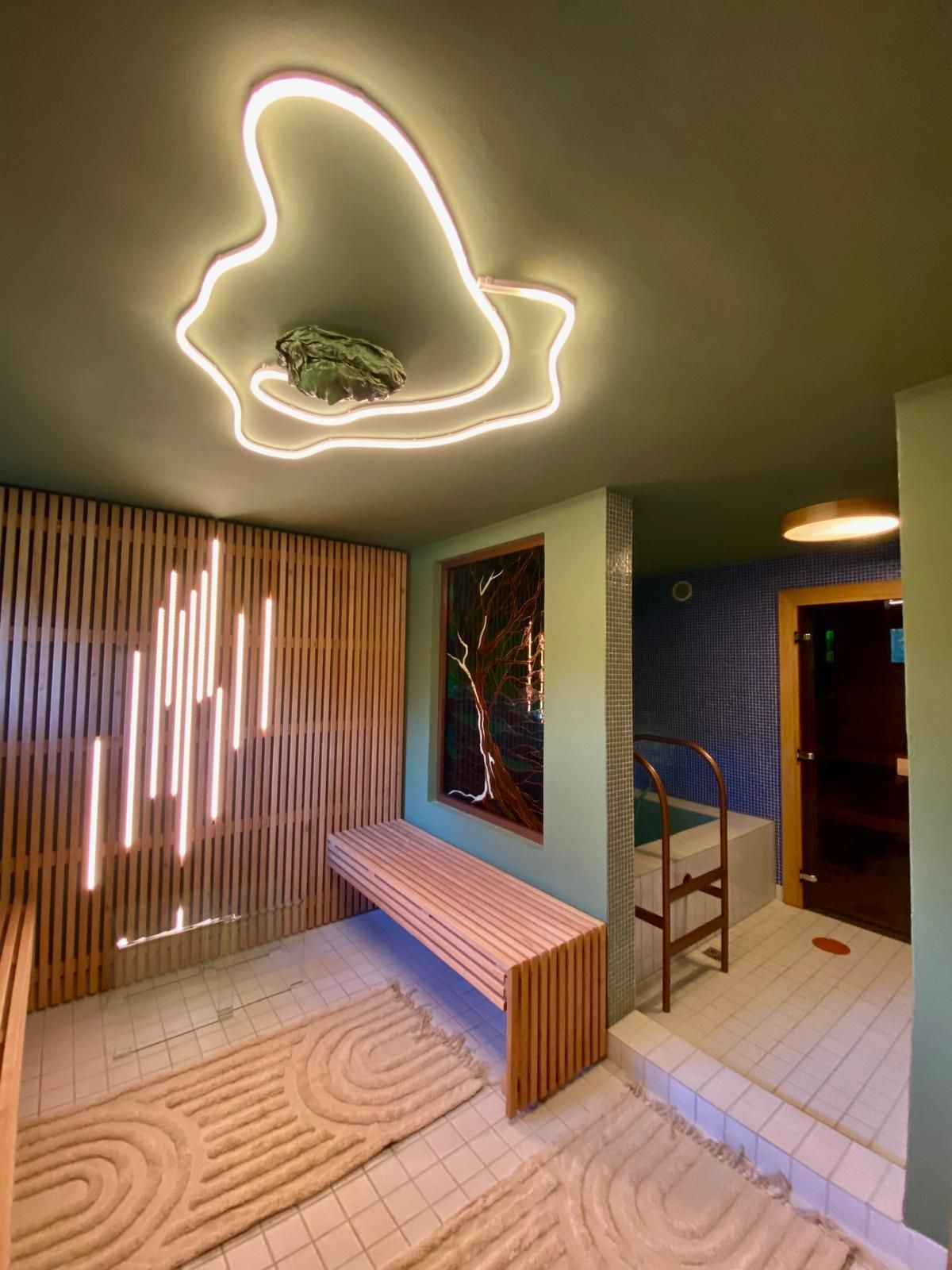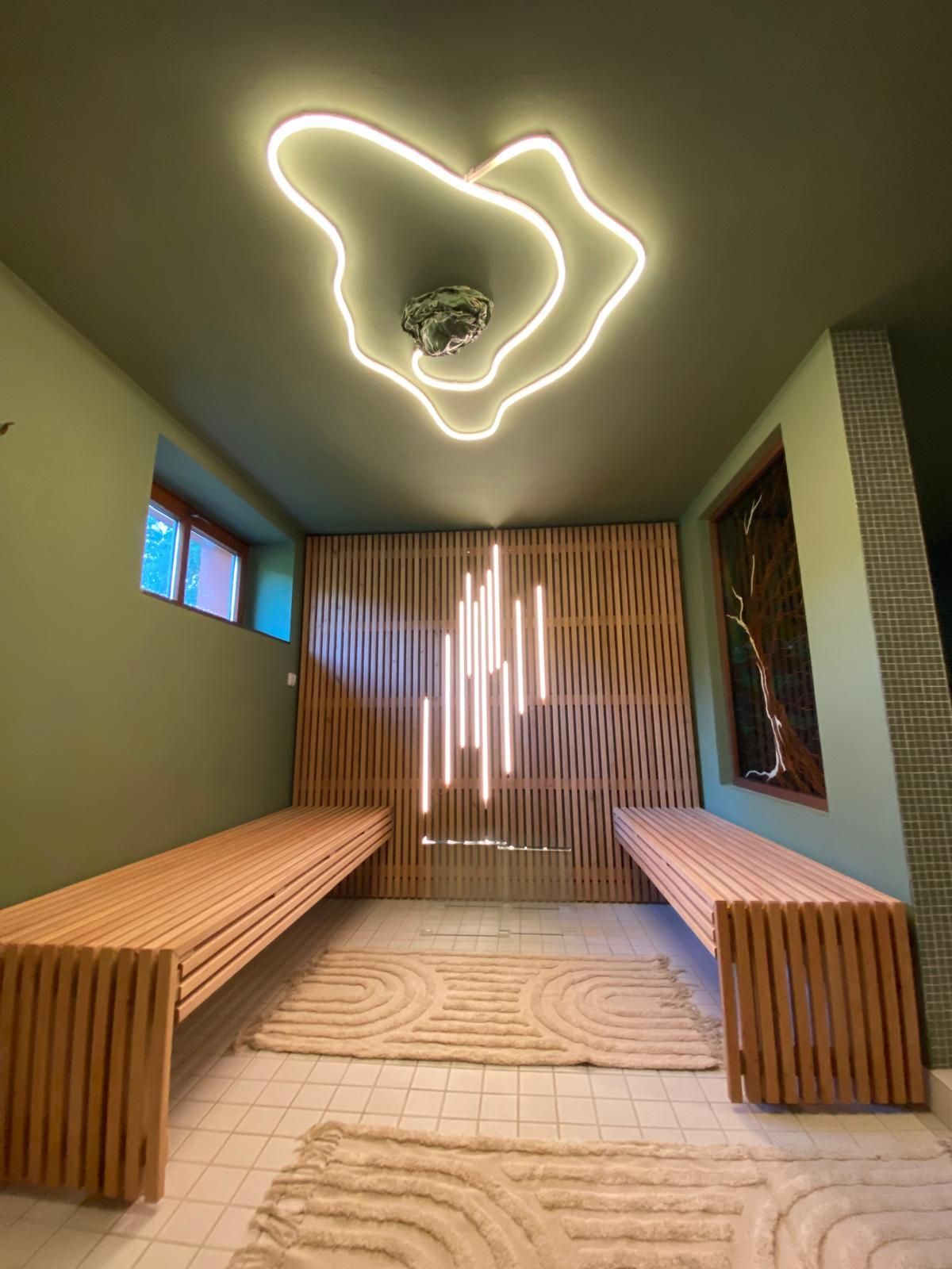 Pro tento projekt jsme měli jasné zadání – zachovat původní dlažbu i mozaikové obklady a zároveň celý prostor barevně a dispozičně sjednotit. Výsledkem je harmonické místo, které propojuje funkčnost s autorským designem. Stropní svítidlo je výsledkem autorské tvorby.