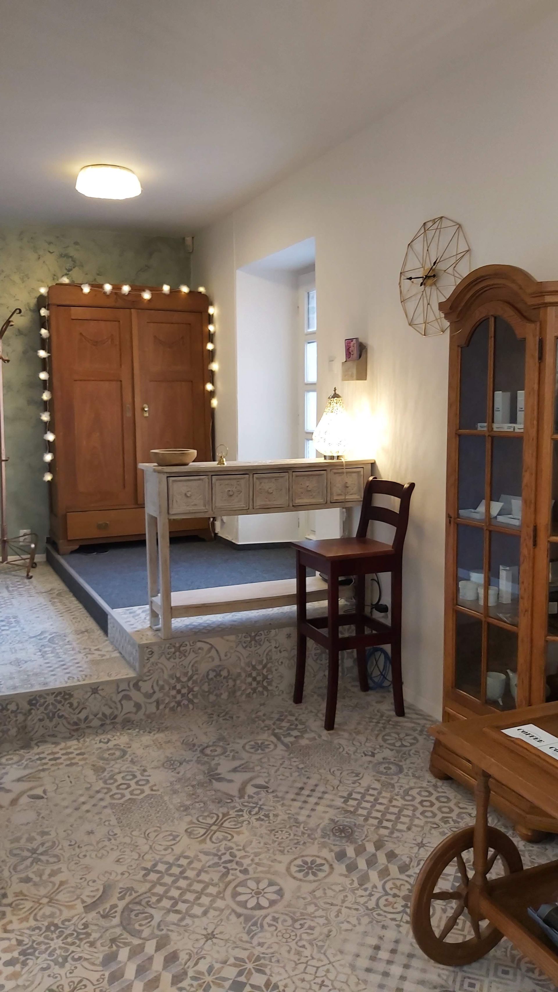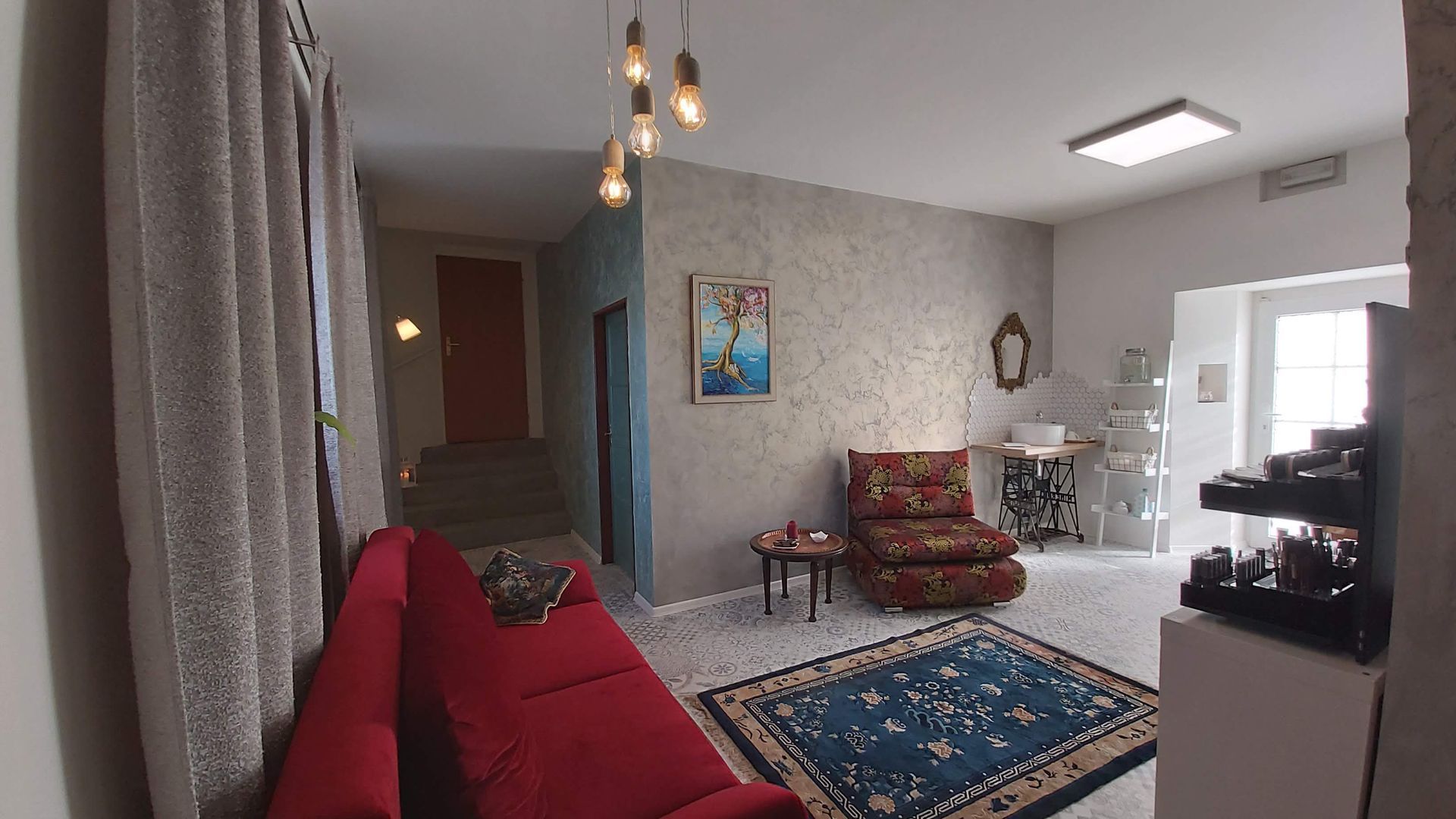 Výsledkem je eklektický interiér, který propojuje moderní prvky s retro a vintage detaily. Na míru vybrané dlažby s jemným vzorem, kombinace kovu, dřeva a textilií i výrazné solitéry v podobě starožitného nábytku vytvářejí harmonické prostředí, kde se klienti cítí příjemně a v klidu. Každá místnost má svou osobitou atmosféru, a přesto všechny dohromady tvoří jednotný, promyšlený celek.