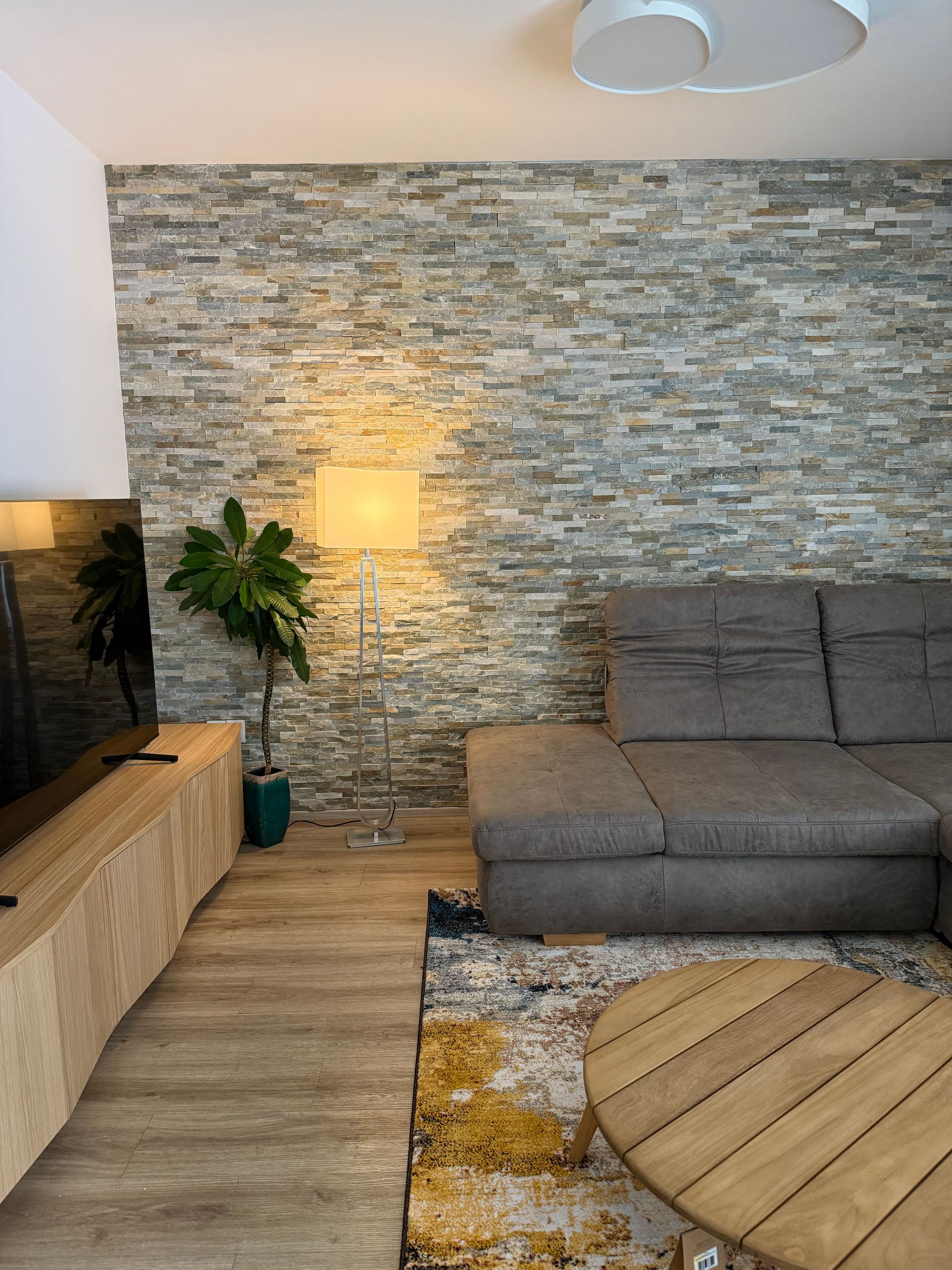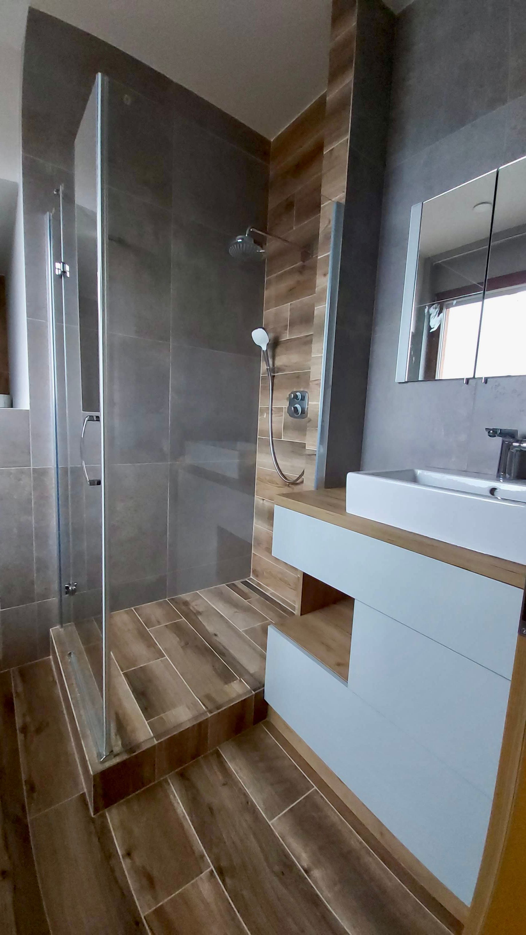 Kuchyně je světlá, minimalistická a praktická, doplněná o decentní strukturovaný obklad a elegantní povrchovou úpravu stěn, která jí dodává hloubku. V koupelně jsme vsadili na kombinaci přírodního dřeva a velkoformátové šedé dlažby, díky čemuž působí prostorně, harmonicky a zároveň moderně.