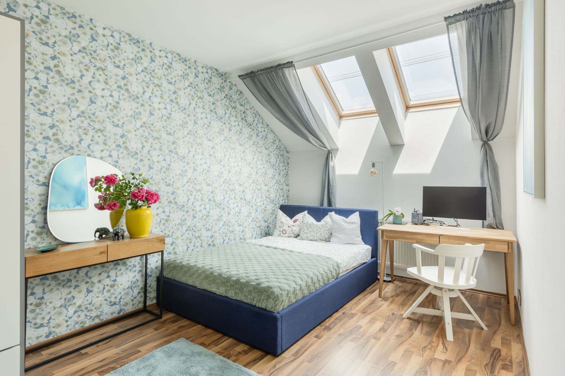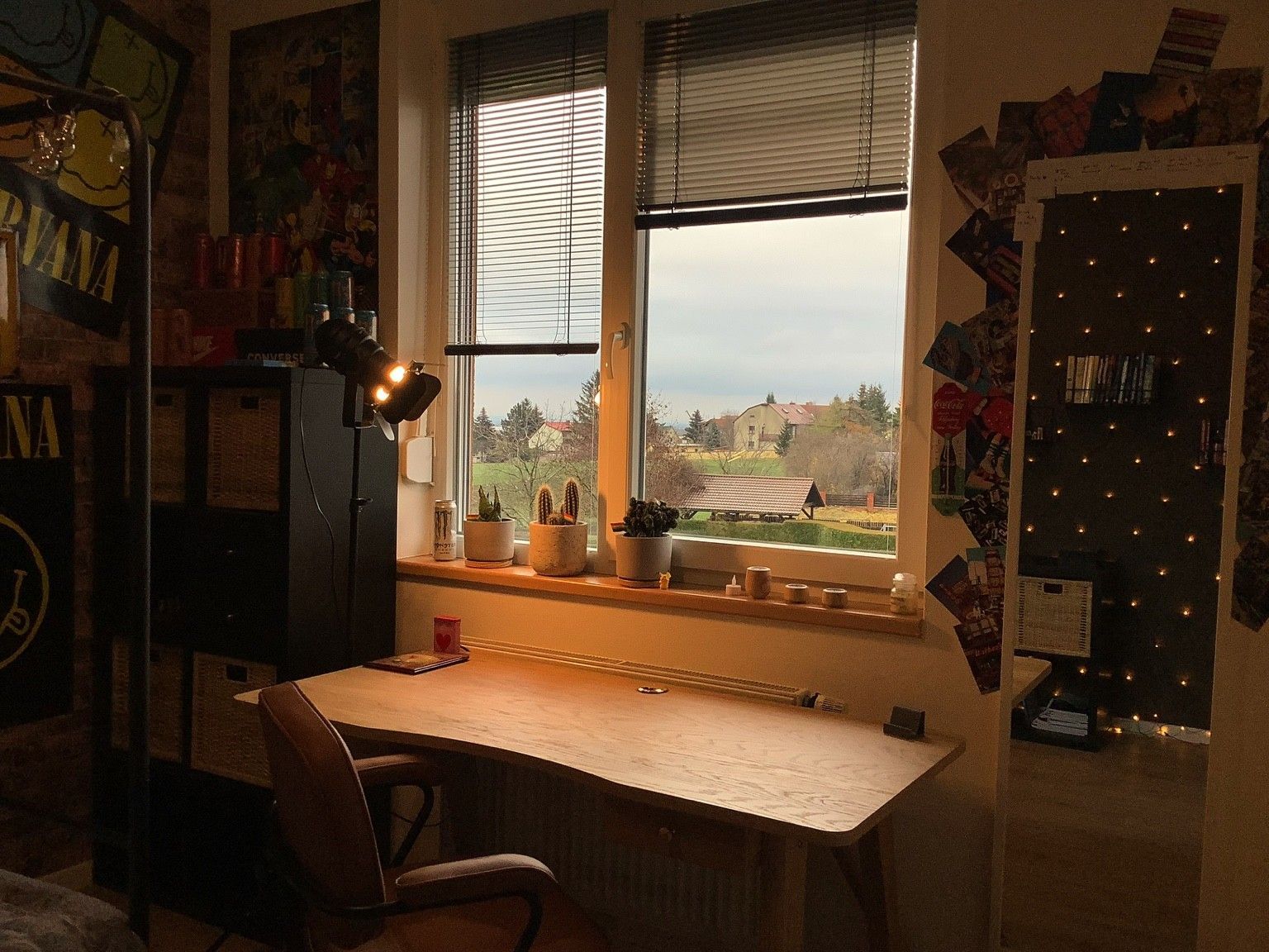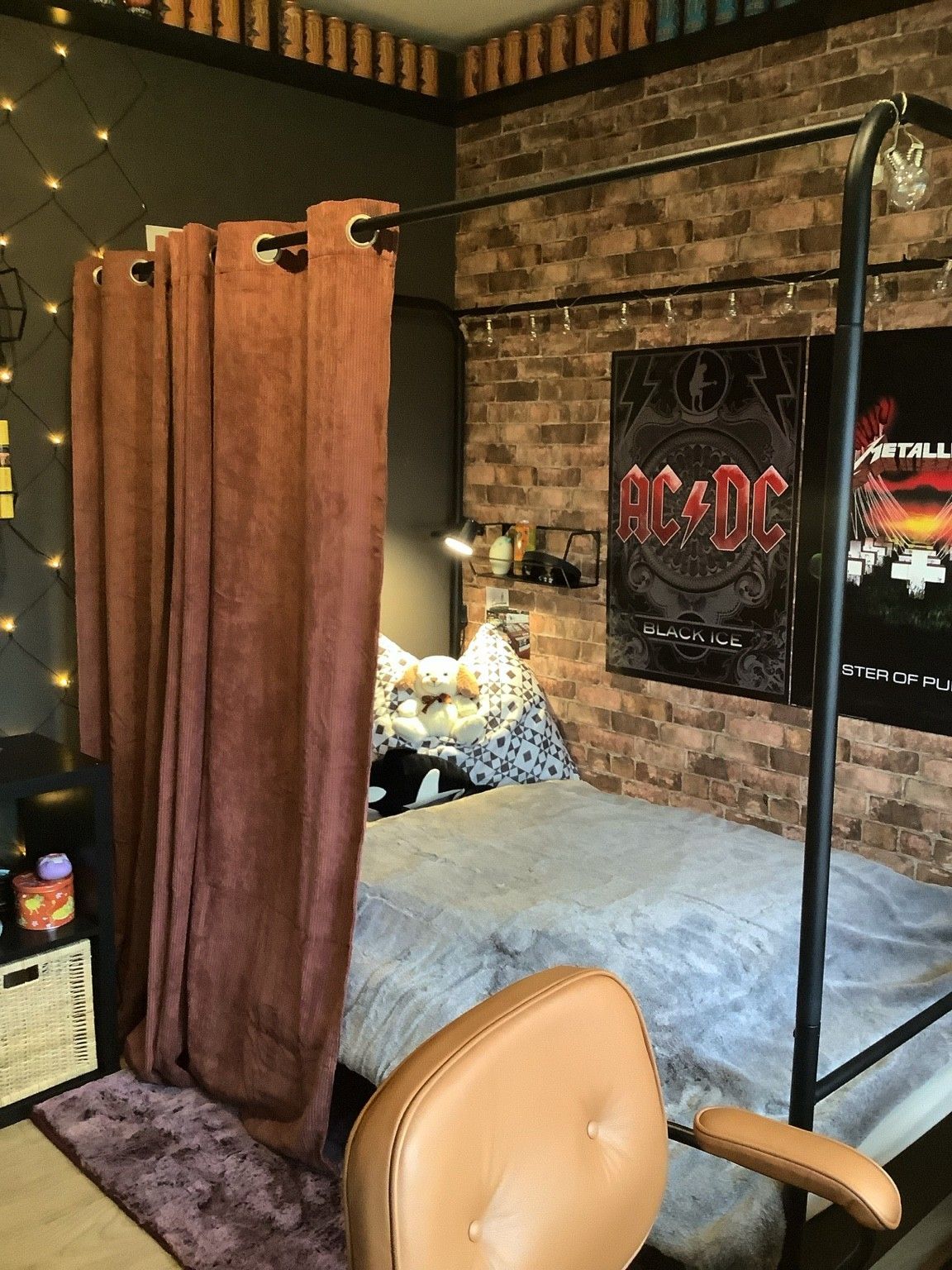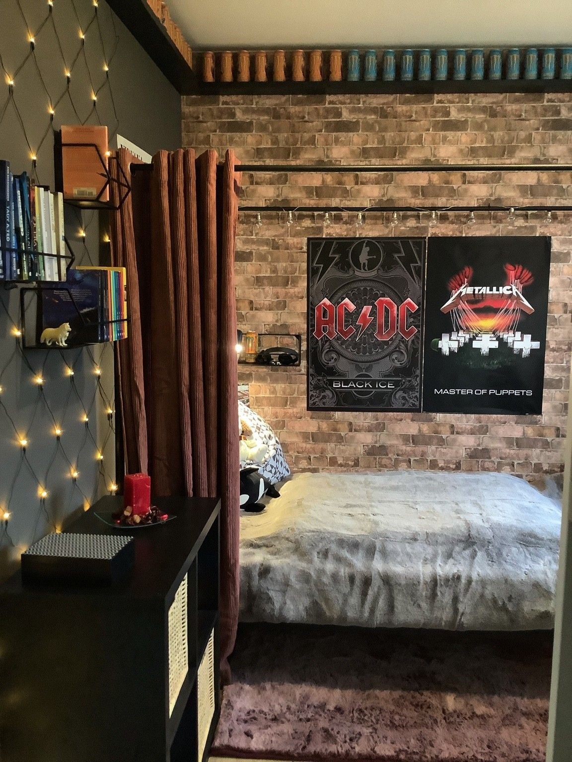 Pro mladou slečnu jsme vytvořili pokoj, který je ztělesněním jejího stylu: industriální cihlová stěna, plakáty legendárních kapel, útulné světelné girlandy a pracovní kout s výhledem do zeleně.