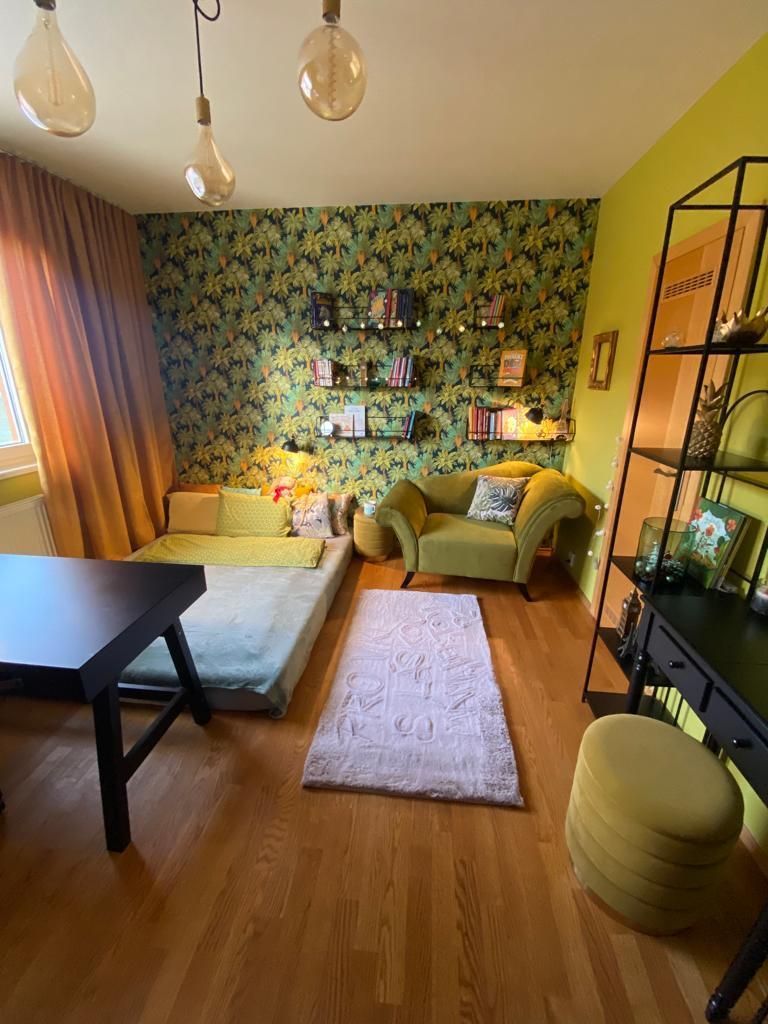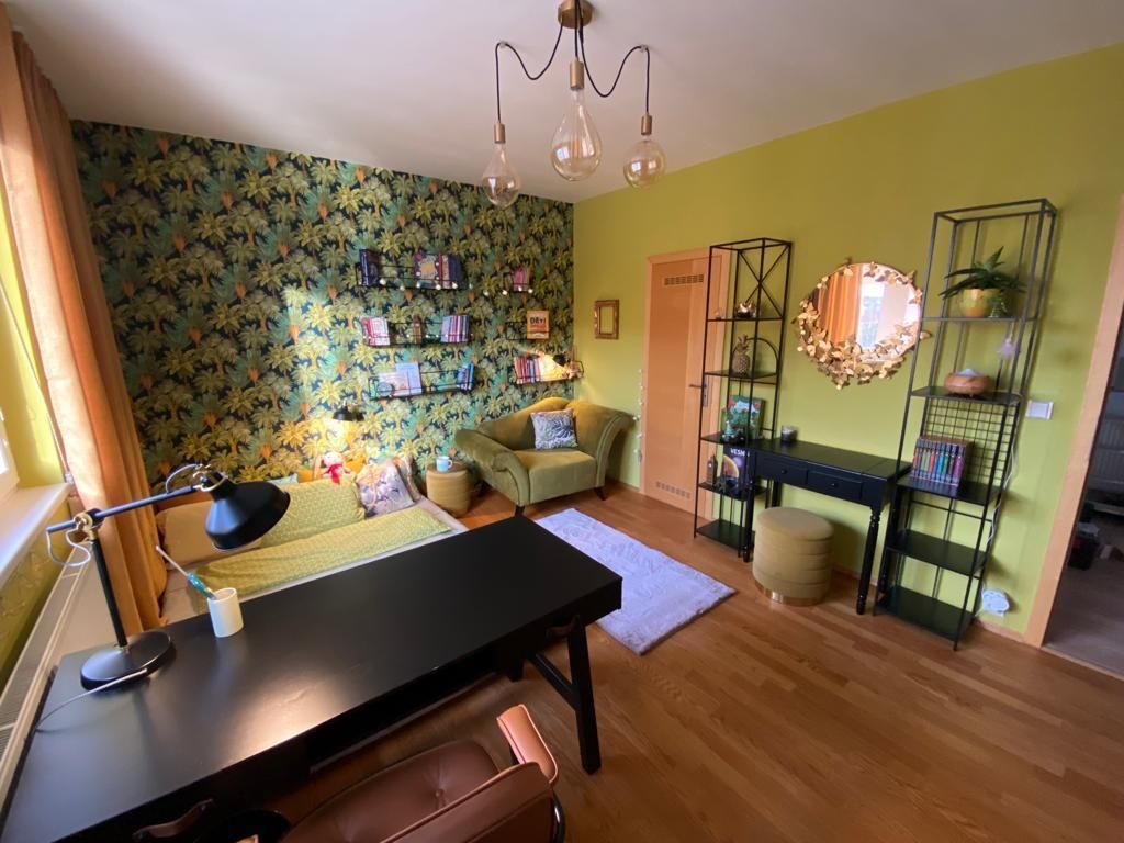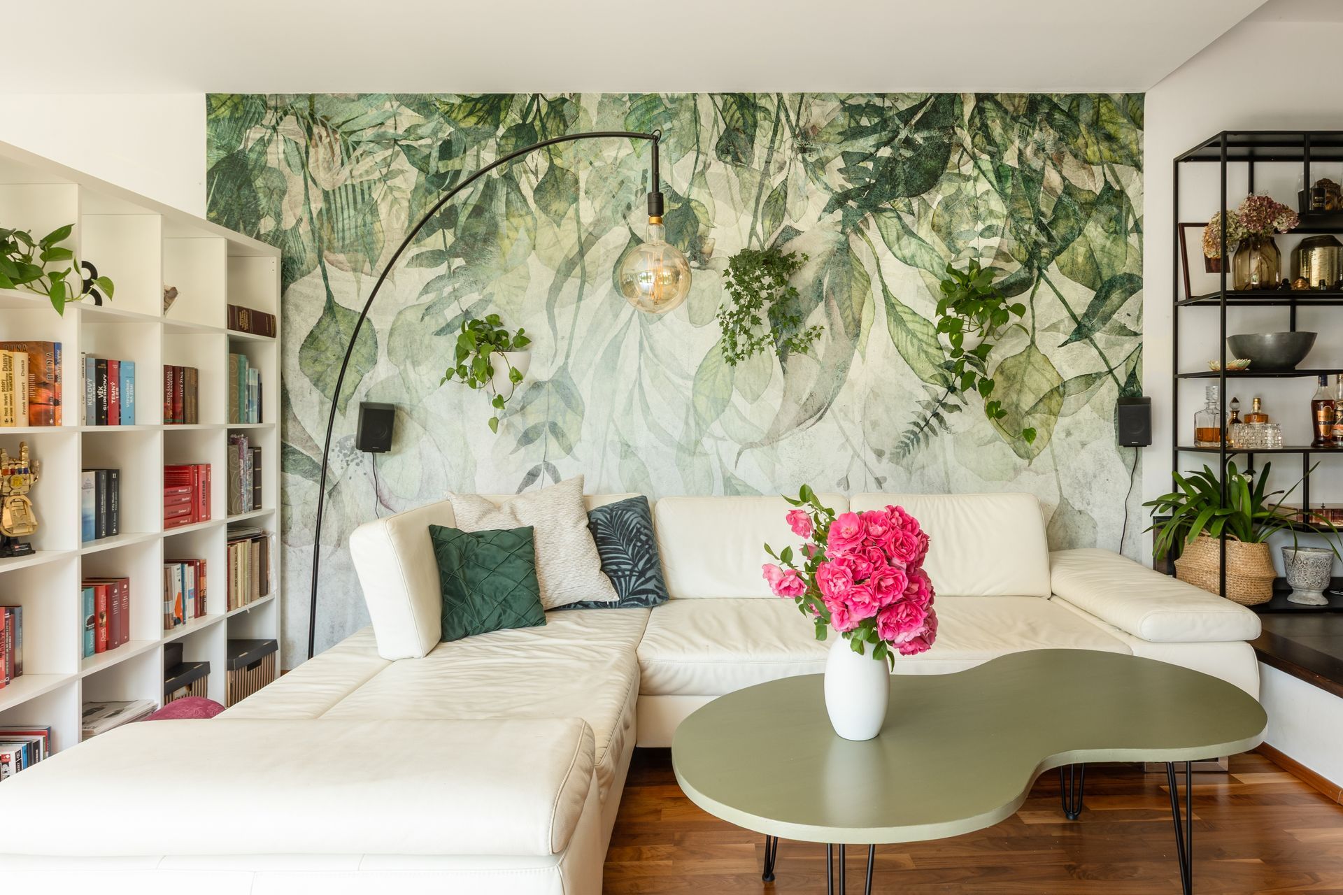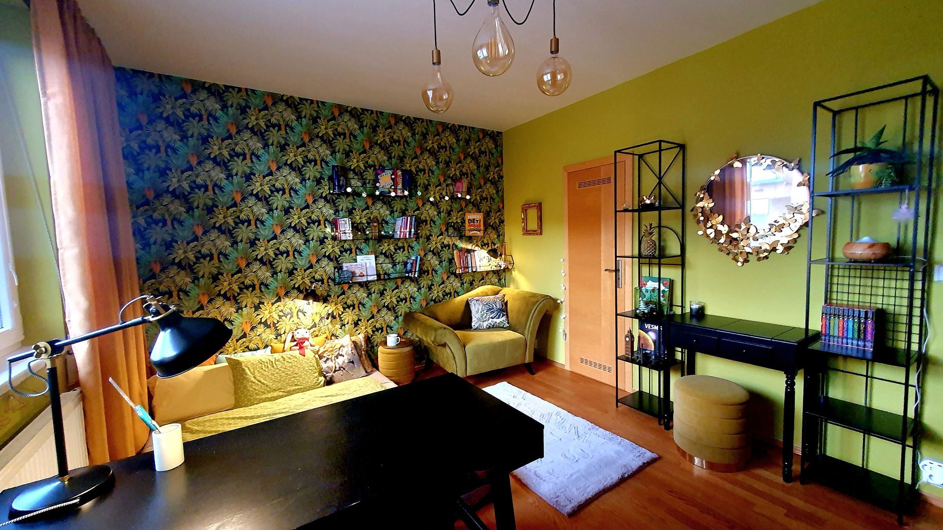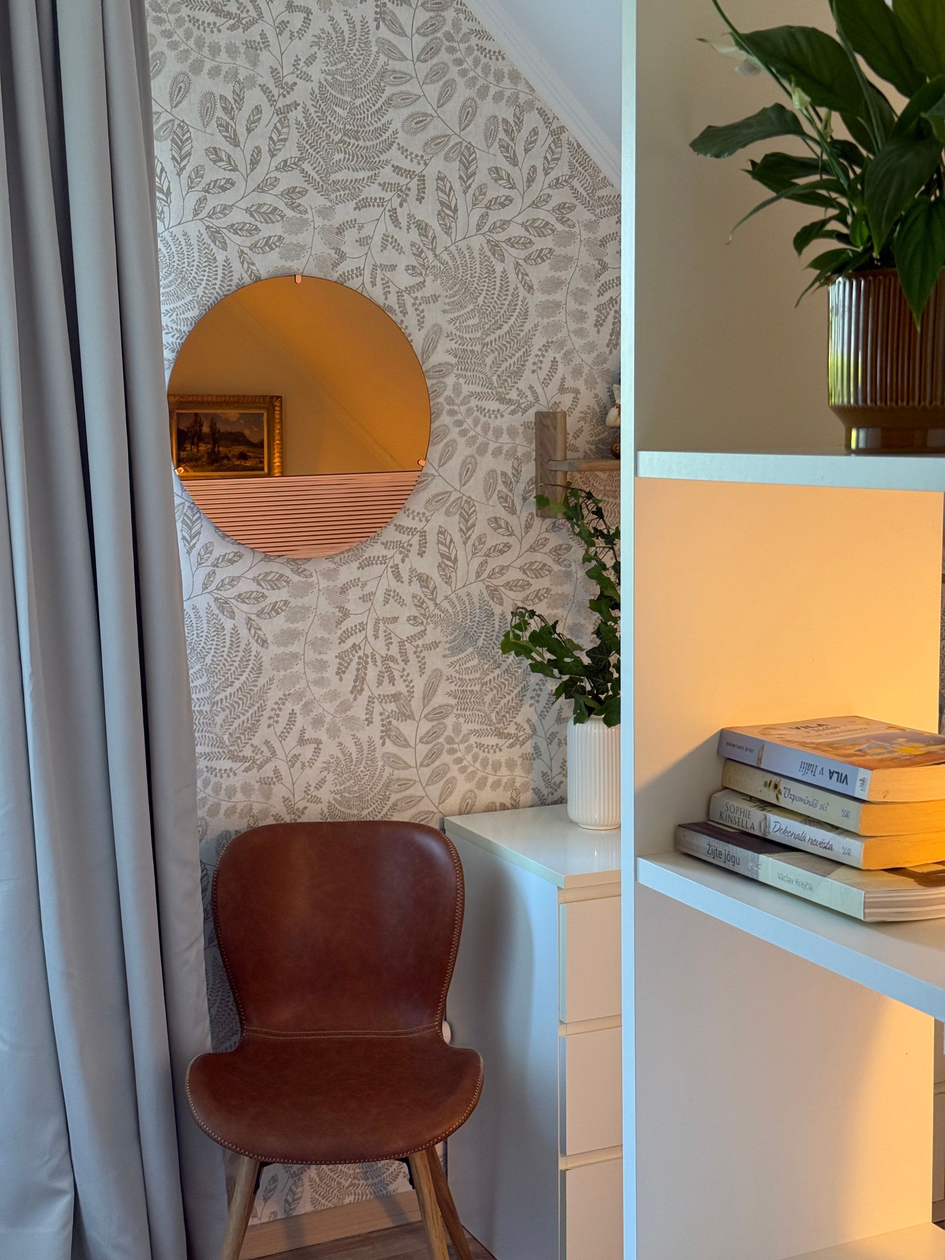 Pokoj pro mladou slečnu jsme navrhli jako prostor plný energie a originality. Výrazná tapeta s tropickým motivem, pohodlná křesla v sametu, kovové police i zrcadlo s dekorem listů dohromady vytváří interiér, který působí sebevědomě, hravě a zároveň útulně.