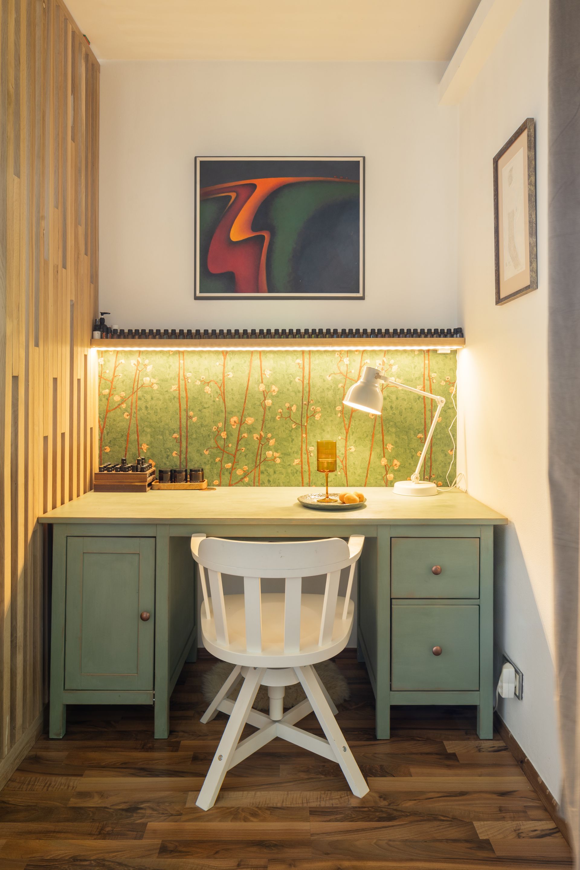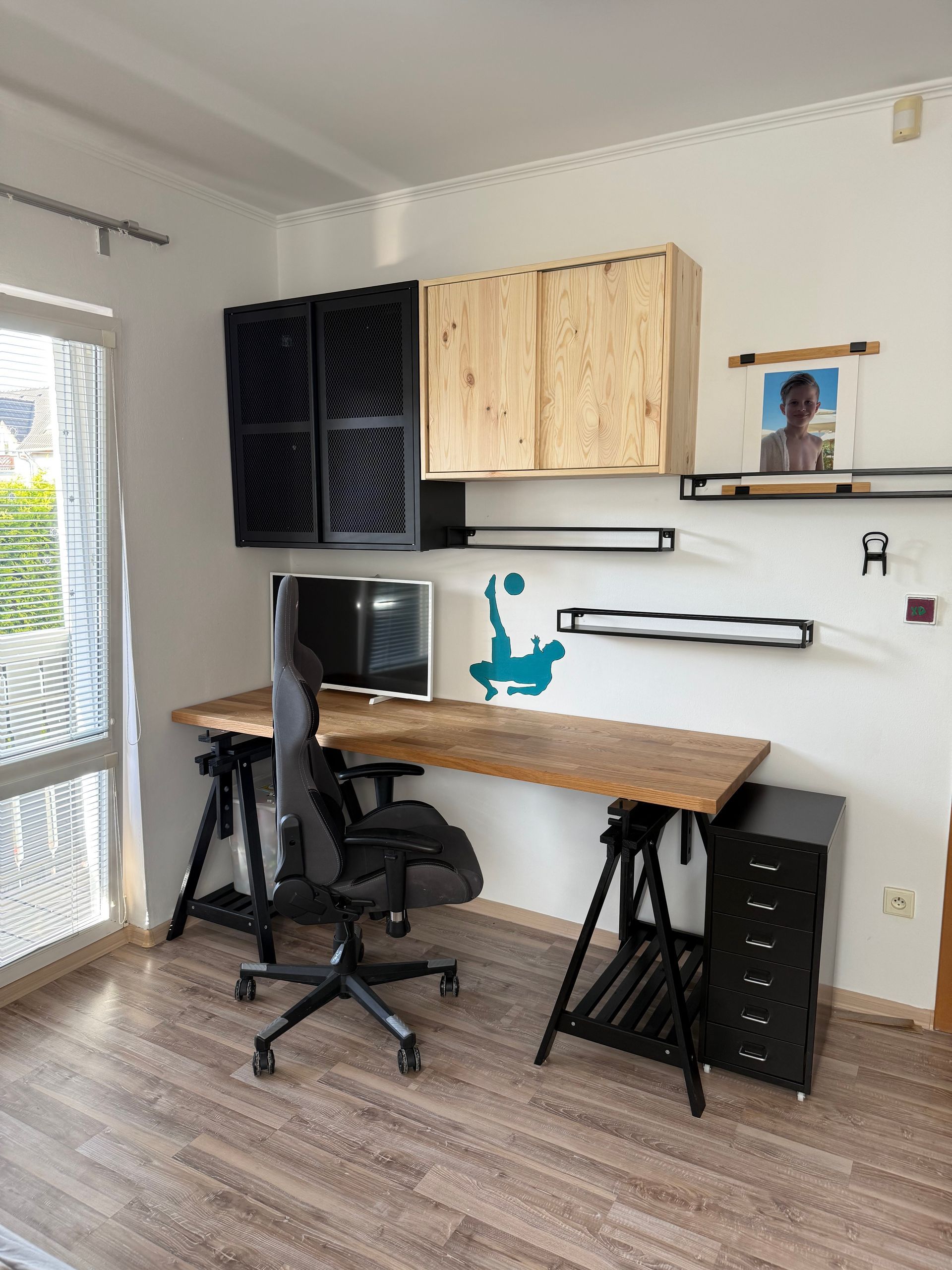 Prostor jsme rozdělili na zónu pro odpočinek, studium i volný čas. Postel s baldachýnem vytváří bezpečný koutek, zatímco dlouhý stůl pod oknem podporuje soustředění i kreativitu. Barevné detaily a osobní doplňky dodávají místnosti energii a charakter, který je mladé majitelce vlastní.