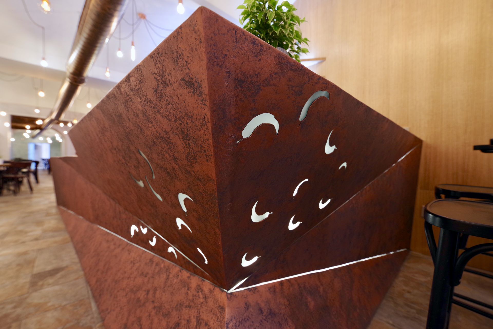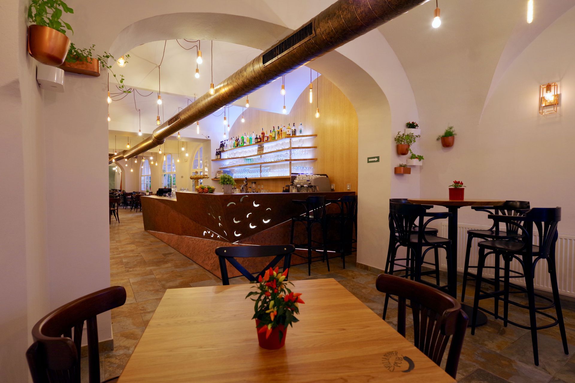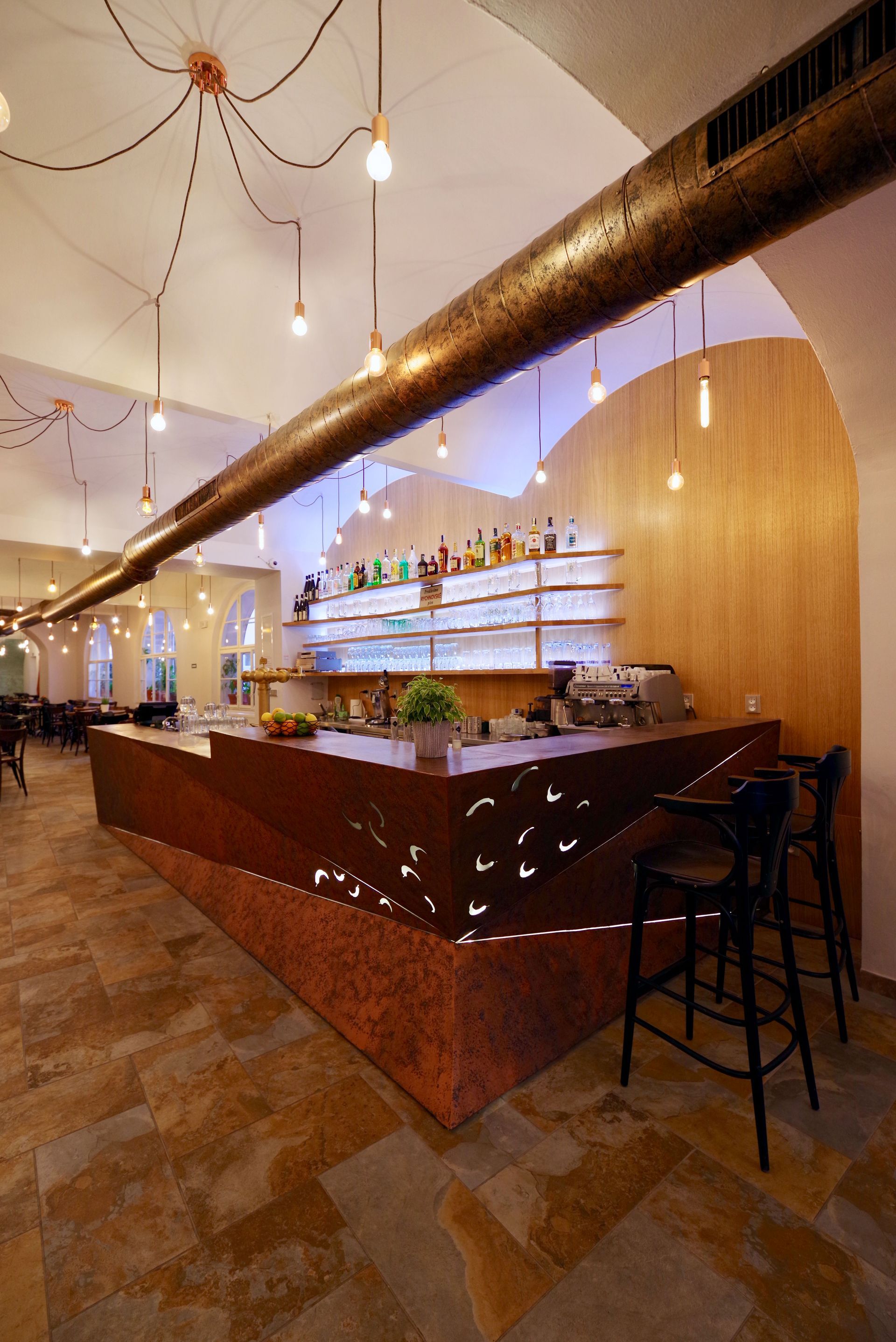 V centru Prahy jsme navrhli a zrealizovali celý interiér restaurace, kde jsme zajišťovali návrh i realizační dohled při jeho tvorbě. Dominantou prostoru je velký bar navržený na míru, vyrobený z ocelového plechu, jehož cortenového vzhledu bylo dosaženo speciálním finálním nátěrem. Originální tvarosloví a podsvětlené perforace dodávají baru jedinečný charakter a propojují industriální prvek s útulnou atmosférou historického prostoru.