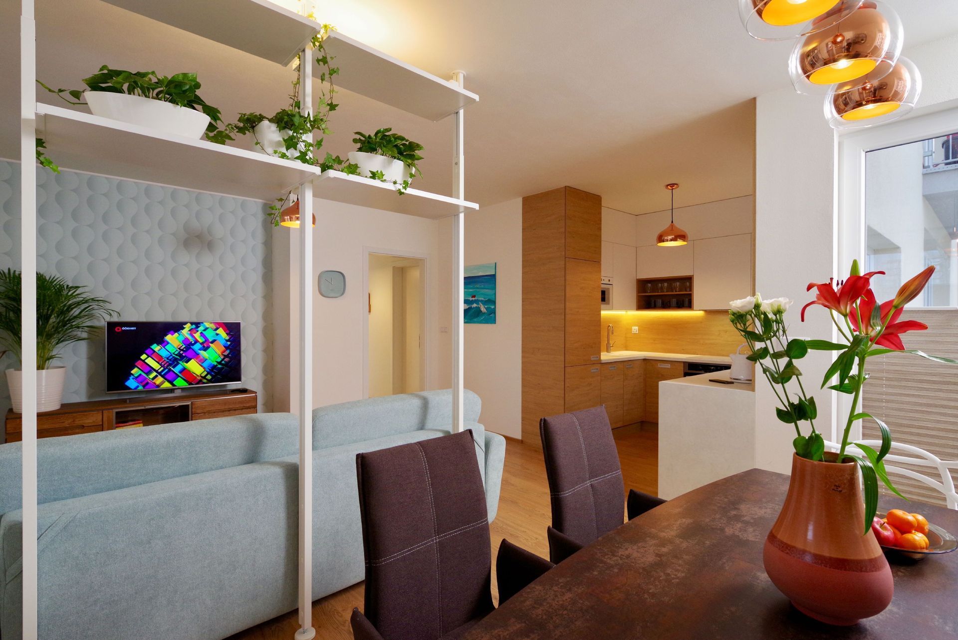 Tento byt jsme navrhli jako pohodlné a elegantní zázemí pro majitele, který žije střídavě v zahraničí a v Praze hledal svůj druhý domov. Interiér kombinuje přírodní materiály, světlé tóny a moderní prvky, díky nimž působí útulně, ale zároveň reprezentativně.