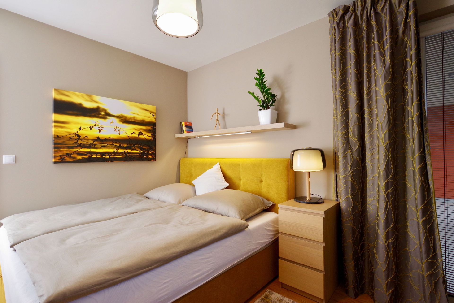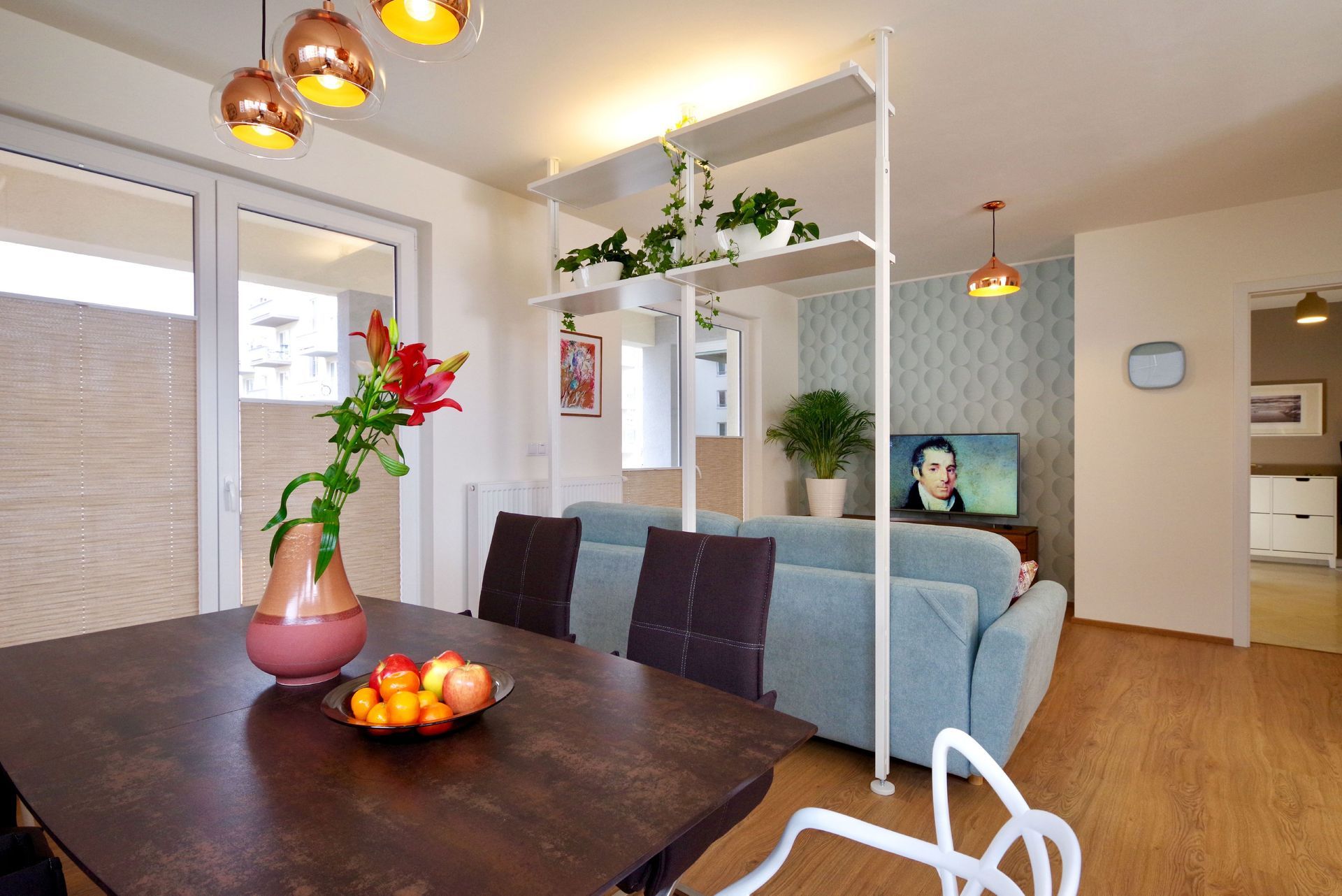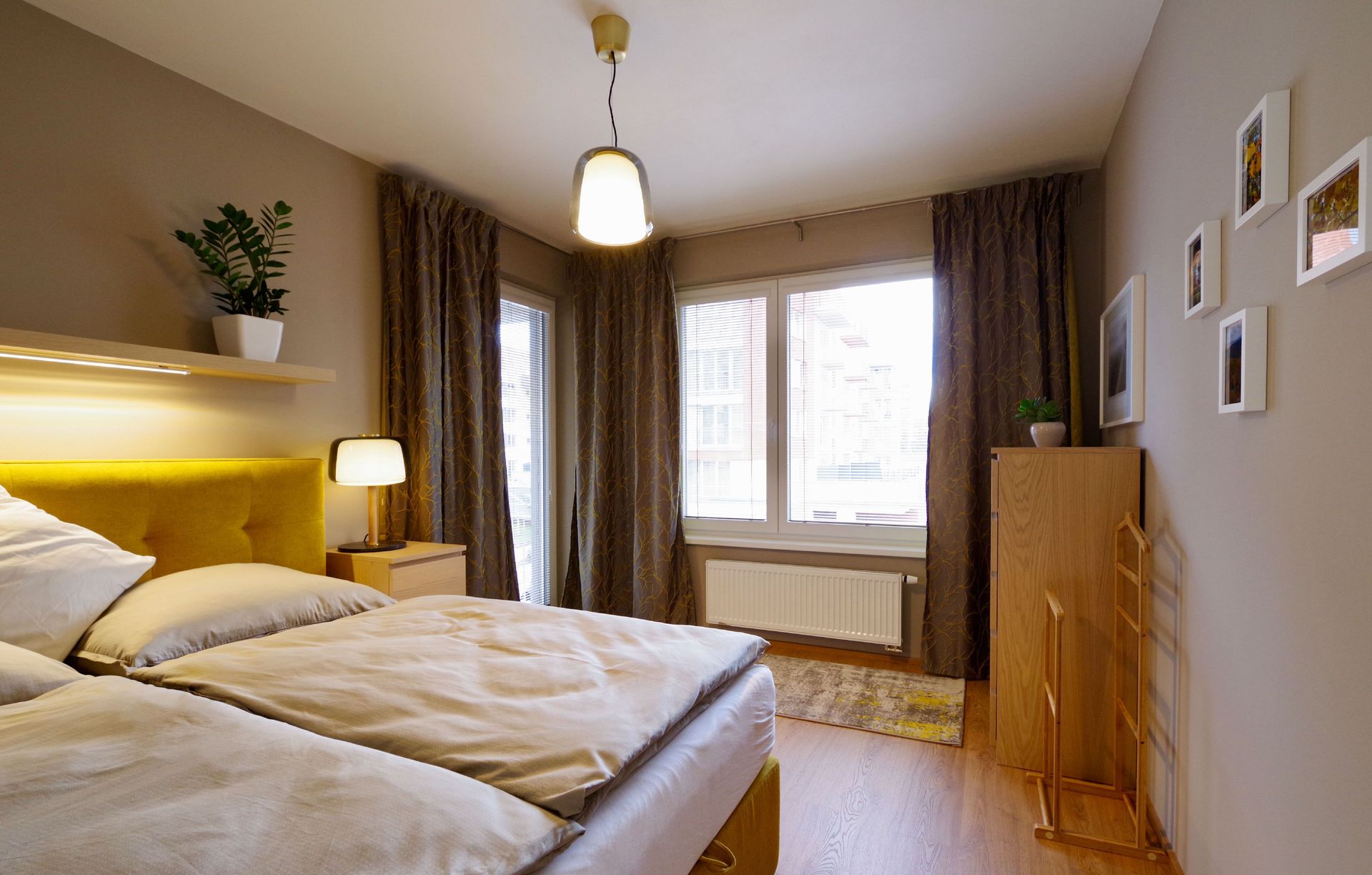 Propojený obývací prostor s kuchyní a jídelnou nabízí dostatek místa pro odpočinek i setkávání, zatímco ložnice v klidných barvách doplněná o akcent žluté vytváří harmonické prostředí pro regeneraci.