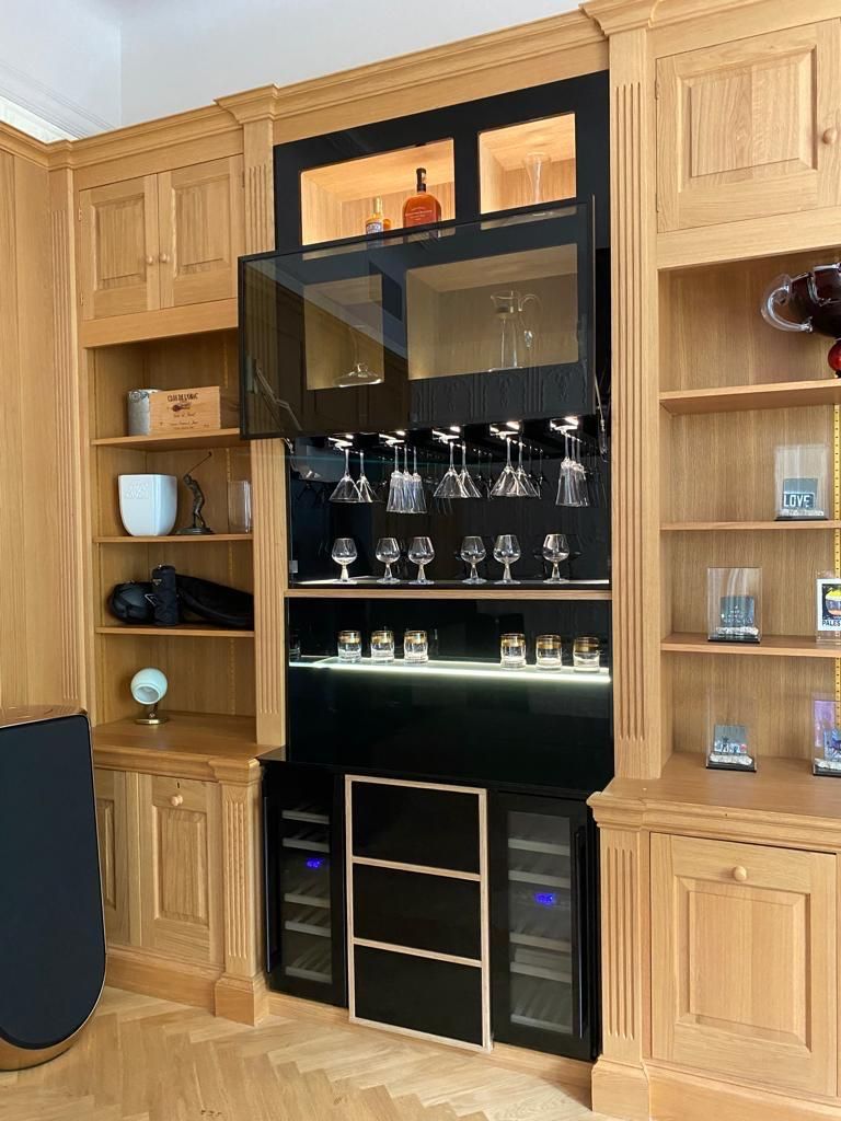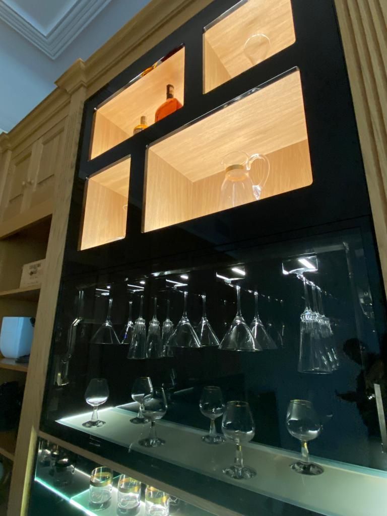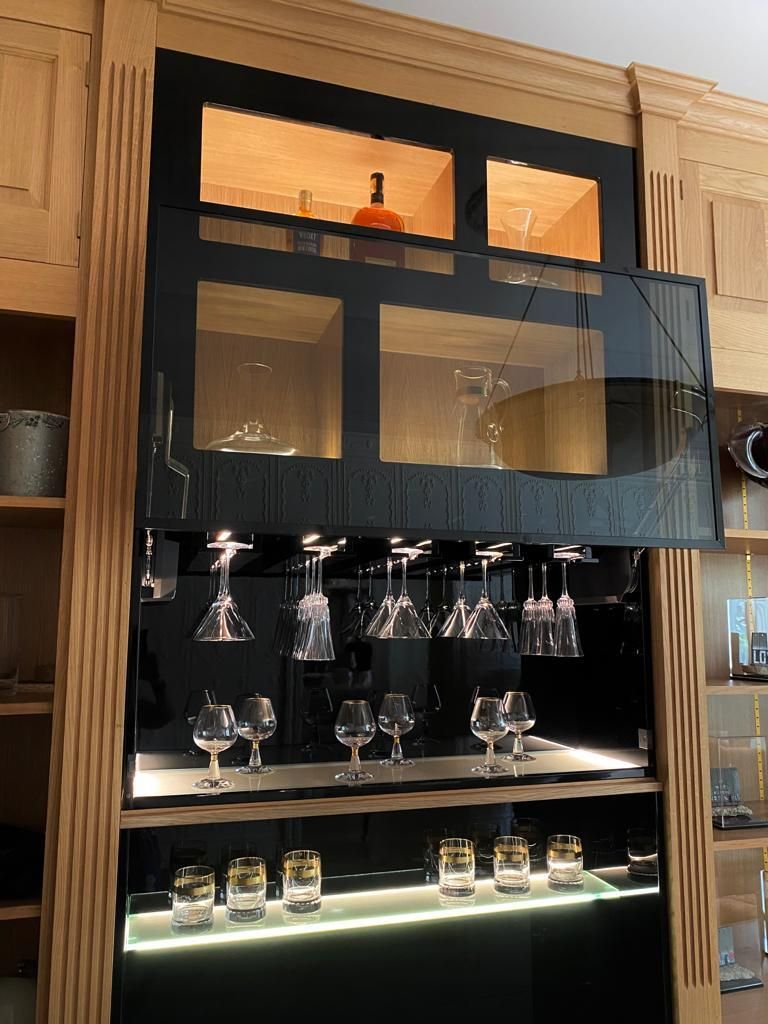 Výsledkem je na míru navržená vinotéka, která spojuje funkčnost s estetickým výrazem. Integrované osvětlení podtrhuje strukturu i barevnost uložených lahví, slouží zároveň jako praktické nasvícení a vytváří atmosféru s nádechem luxusu. Pro maximální komfort je vinotéka vybavena automatickým otevíráním, které podtrhuje její moderní charakter.